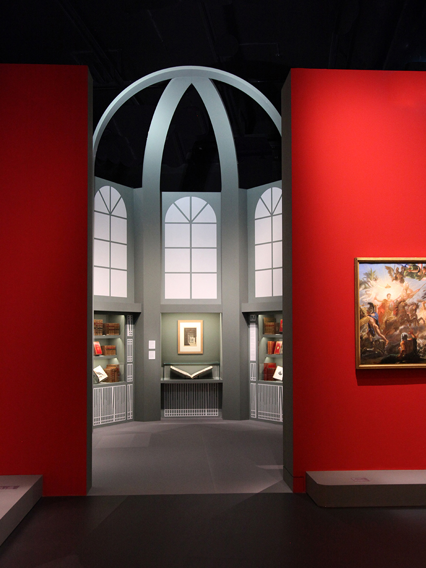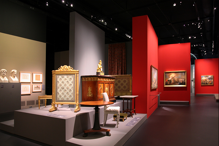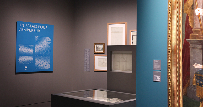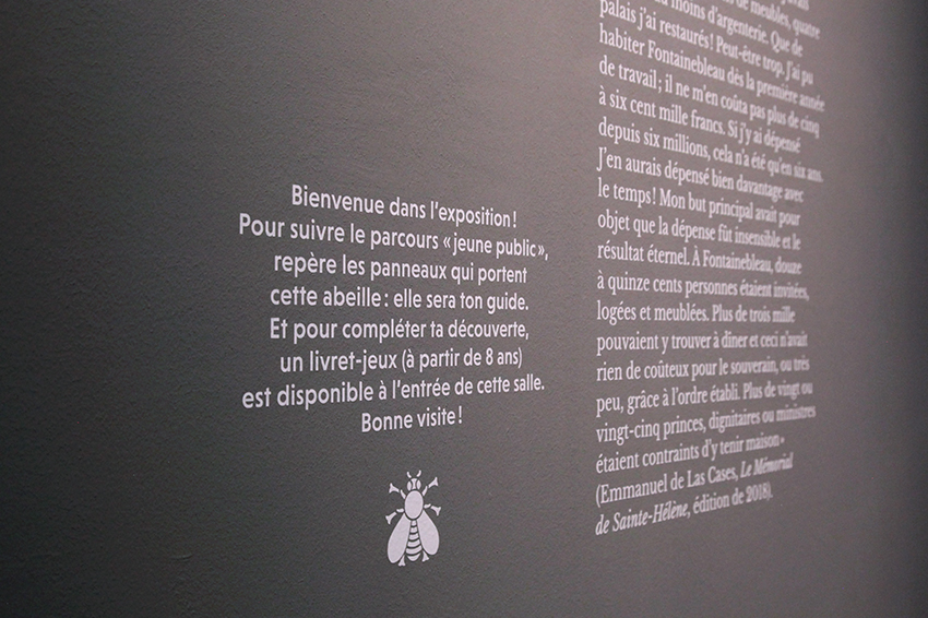 Design graphique de l'exposition temporaire "Un palais pour l'empereur, Napoléon Ier à Fontainebleau", au château de Fontainebleau, dans la Salle de la Grande Cheminée.